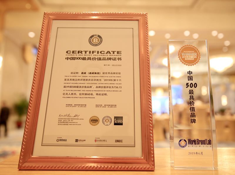 2019年6月26日,由世界品牌實驗室、《世界企業家》等共同主辦的2019年第十六屆世界品牌大會暨2019年(第十六屆)中國500最具價值品牌發布會在京隆重舉行。繼2018年以550.29億元突破550億元大關之后,2019年通威集團以756.15億元再創品牌價值新高,連續第16年入選中國品牌國家隊行列!從2004年的19億元,到2019年突破756億元,通威品牌價值在短短16年里增長了近40倍,展示了全國乃至全球綠色農業和綠色能源龍頭企業和領軍品牌的雄厚實力。