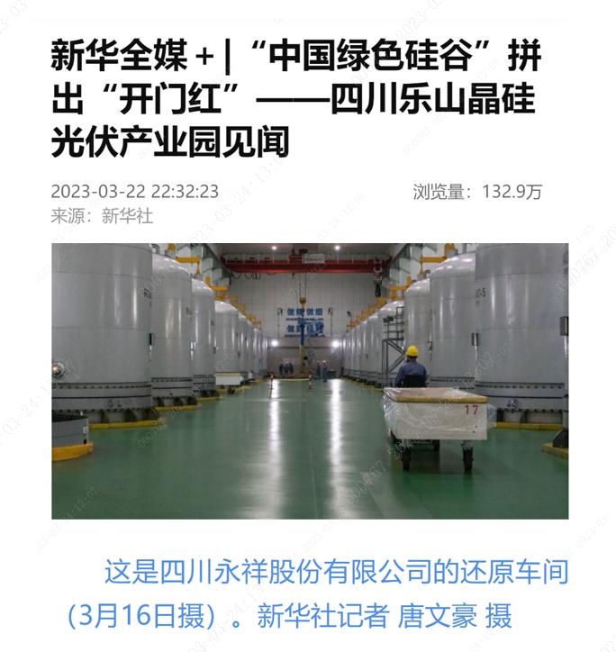 3月22日,新華社以《“中國(guó)綠色硅谷”拼出“開門紅”——四川樂山晶硅光伏產(chǎn)業(yè)園見聞》為題,報(bào)道了樂山晶硅光伏穩(wěn)定生產(chǎn)經(jīng)營(yíng)的良好態(tài)勢(shì),聚焦永祥在晶硅光伏領(lǐng)域綠色高質(zhì)量發(fā)展。